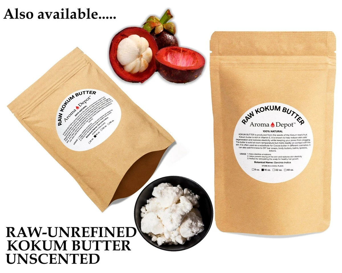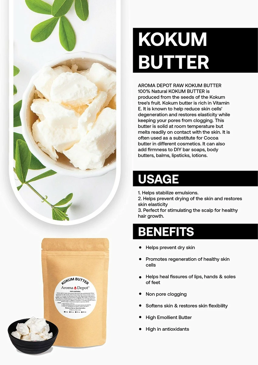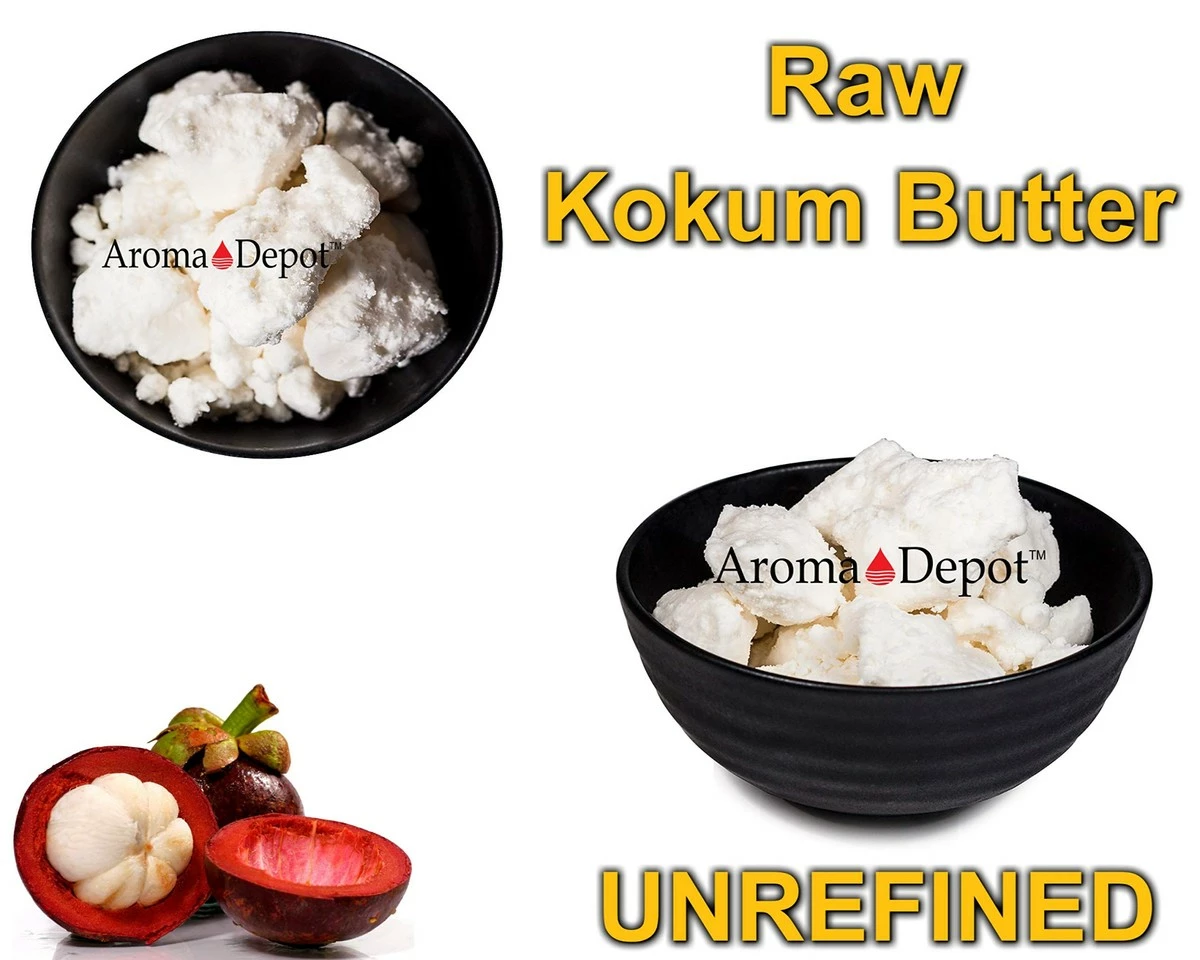 Kokum butter, by nature, is a dry and flaky butter. This dry and flaky appearance causes many to think that the butter has gone rancid, but this is a natural characteristic of Kokum butter. If the butter was melted when you receive it, please leave it in a refrigerator until the butter gets chilled and becomes firm & stable. Once the butter has become firm, you may apply it gently and clean out of the container. MUST STORED THIS BUTTER IN A COOL DARK PLACE AWAY FROM THE SUNLIGHT. Kokum butter is naturally produced from the seeds of the kokum tree’s ( Garcinia Indica ) fruit. It is commonly used in place of Cocoa Butter as an ingredient for several different cosmetics. The density of this butter holds ingredients together to create a better and stiffer product. Kokum butter is known for its smooth, dense texture suitable for cosmetic and toiletry applications. Some of the traditionally known benefits of kokum butter are: * Promotes skin elasticity *Helps prevents drying of the skin & restore damaged skin * Helps regenerates skin cells & reduces degeneration of skin cells *Non-pore clogging ( non-comedogenic ) * Helps with fissures of the lips, hands, and soles of feet * Helps stabilize emulsions * High oxidative stability * Ingredient for stiffening DIY soaps and creams * Great for Stimulating the scalp for healthy hair growth * Sold as Volume* Suggested Uses: In cosmetics, body butter, conditioners, make-up foundations, lipsticks, moisturizers, hair care products, toiletries & pharmaceutical industry as creams, skin tonic, lotion, acne products, balms, shaving creams & bar soaps. Use from 3% to 100% Recommended Usage Percentage: Lotions & Creams: 1-3% Balms: 5-100% Bar Soaps: 2-5% Hair Conditioners: 1-3%