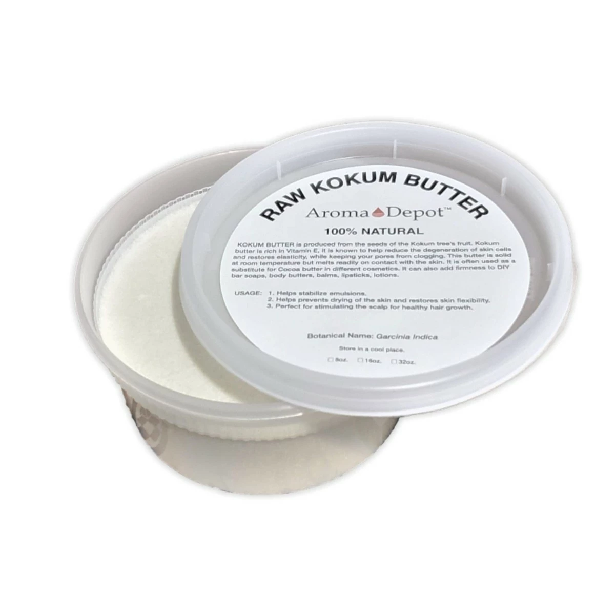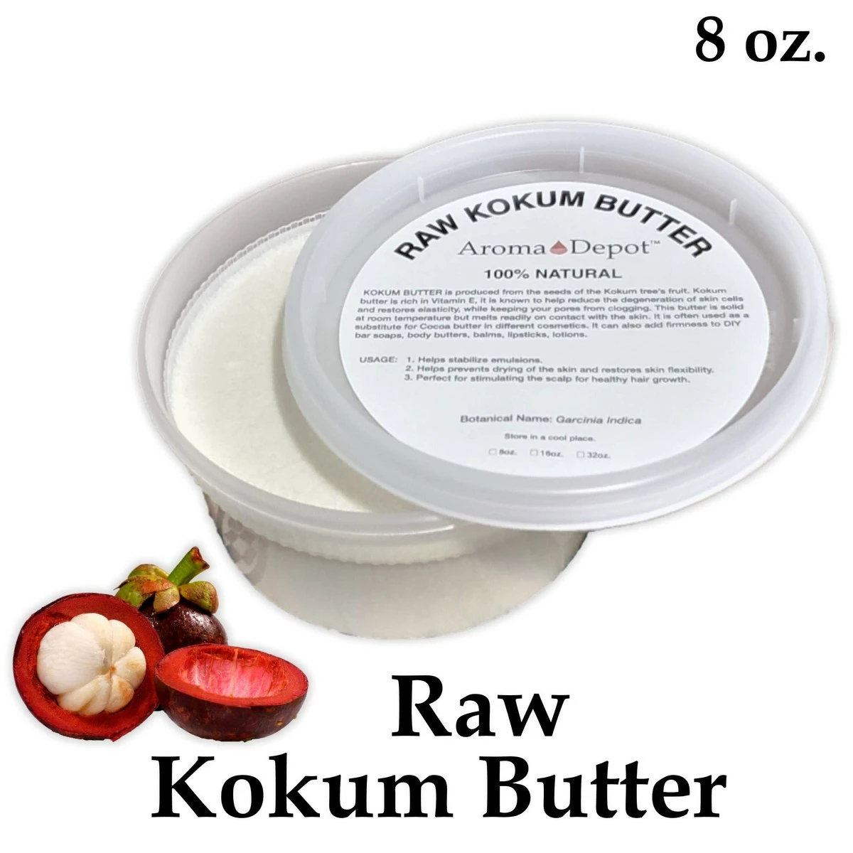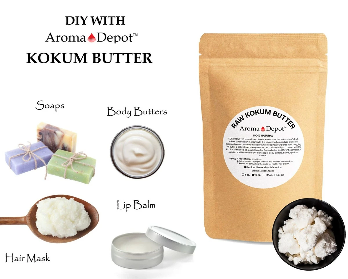 Kokum butter, by nature, is a dry and flaky butter. This dry and flaky appearance causes many to think that the butter has gone rancid, but this is a natural characteristic of Kokum butter. If the butter was melted when you receive it, please leave it in a refrigerator until the butter gets chilled and becomes firm & stable. Once the butter has become firm, you may apply it gently and clean out of the container. MUST STORED THIS BUTTER IN A COOL DARK PLACE AWAY FROM THE SUNLIGHT. Kokum butter is naturally produced from the seeds of the kokum tree’s ( Garcinia Indica ) fruit. It is commonly used in place of Cocoa Butter as an ingredient for several different cosmetics. The density of this butter holds ingredients together to create a better and stiffer product. Kokum butter is known for its smooth, dense texture suitable for cosmetic and toiletry applications. Some of the traditionally known benefits of kokum butter are: * Promotes skin elasticity *Helps prevents drying of the skin & restore damaged skin * Helps regenerates skin cells & reduces degeneration of skin cells *Non-pore clogging ( non-comedogenic ) * Helps with fissures of the lips, hands, and soles of feet * Helps stabilize emulsions * High oxidative stability * Ingredient for stiffening DIY soaps and creams * Great for Stimulating the scalp for healthy hair growth * Sold as Volume* Suggested Uses: In cosmetics, body butter, conditioners, make-up foundations, lipsticks, moisturizers, hair care products, toiletries & pharmaceutical industry as creams, skin tonic, lotion, acne products, balms, shaving creams & bar soaps. Use from 3% to 100% Recommended Usage Percentage: Lotions & Creams: 1-3% Balms: 5-100% Bar Soaps: 2-5% Hair Conditioners: 1-3%