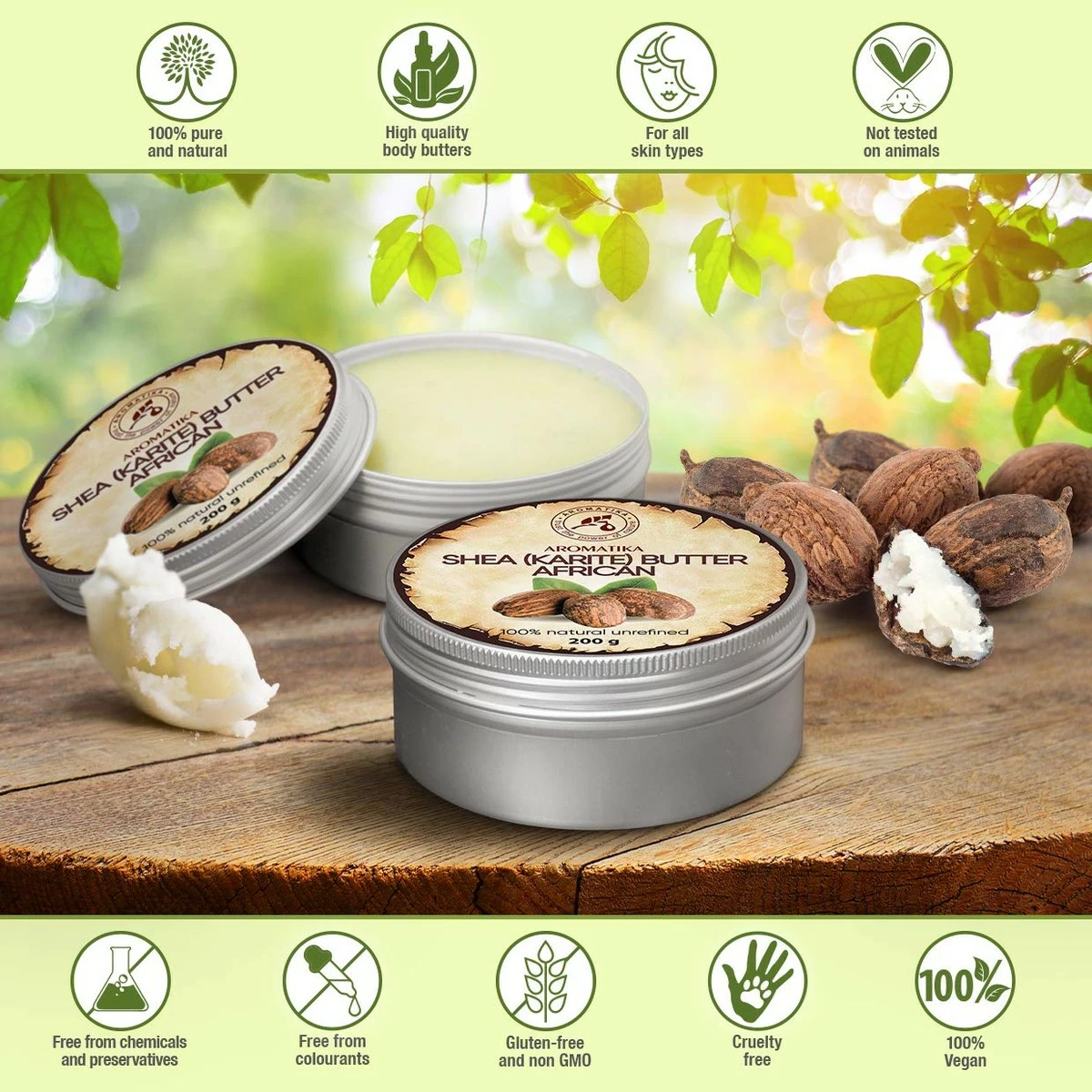 - Shea butters contain no synthetic components, preservatives, or colouring pigments. Only 100 % pure and natural unrefined Shea butter.