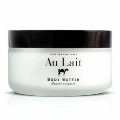 Scottish Fine Soaps Au Lait Body Butter 7 Oz (200 mL) From Scotland. Au Lait Body Butter is one of the best friends your skin will ever have. Enriched with nourishing Milk and creamy Cocoa Butter for an intense moisturising experience, it will leave your skin soft, smooth and delicately fragranced – natural goodness with a splash of milk. Use Au Lait Body Wash first, then follow with the Au Lait body butter.