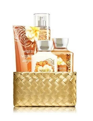 Ultra Shea Body Cream (8 oz.), Body Lotion (8 fl oz), Shower Gel (10 fl oz.) and Fine Fragrance Mist (8 fl. oz). It comes in a gold woven basket.