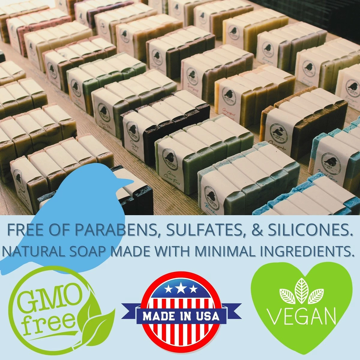 - MADE IN THE USA WITH QUALITY INGREDIENTS- Enjoy our artisan handmade soap, highlighted by a rustic texture on the top of our soap bars that is a natural result of being a handmade product. Made by hand through traditional, small batch, cold process methods in order to best preserve the quality and effectiveness of our natural and organic ingredients. Cruelty Free. GMO-Free. Paraben Free, Silicone Free, Sulfate Free, and Always Made with Minimal Ingredients.