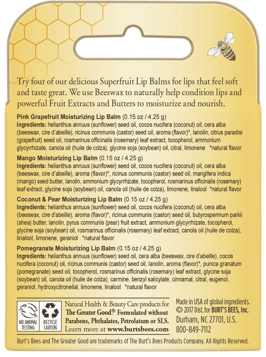 - TOTAL HYDRATION: Hydrate and smooth dry lips with Beeswax and fruit extracts packed into every tube of Burt’s Bees lip balm
