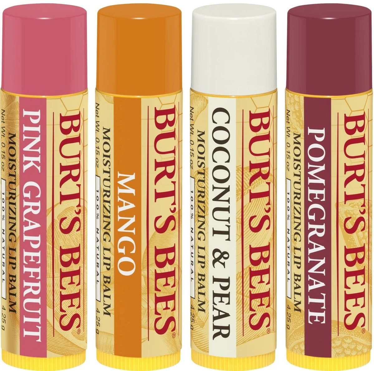 - LIP CARE: Bursting with all natural flavors, refresh and nourish your lips with Burt’s Bees Moisturizing Lip Balm in four naturally nourishing flavors: Pink Grapefruit, Mango, Coconut & Pear, and Pomegranate