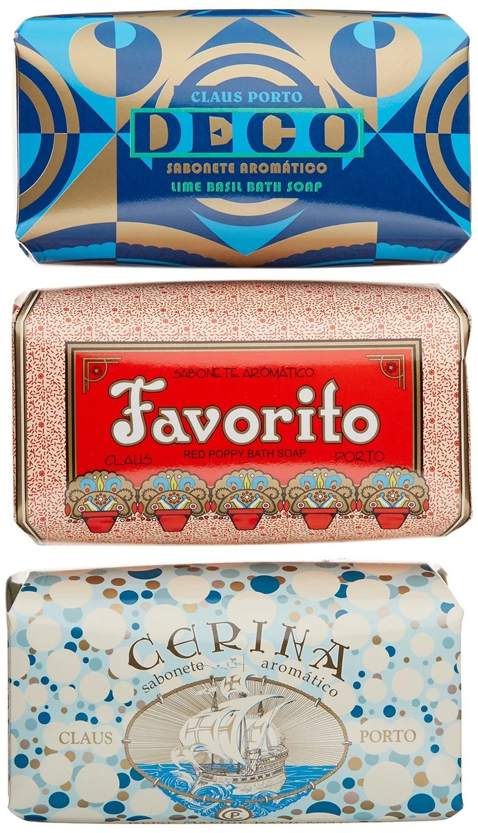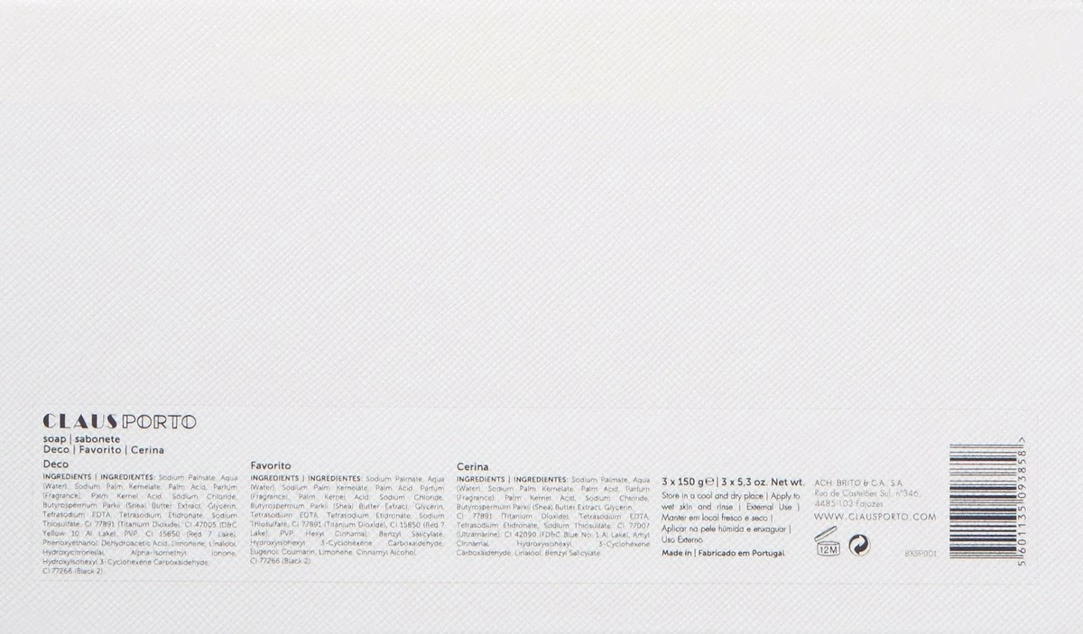 Comes with 3 soaps of the Deco collection, Deco, Favorito and Cerina, each with a unique fragrance and personality. Blended with shea oil, these colorful soaps draw on the dramatic designs that first made Claus Portoβs name in the early 20th Century.