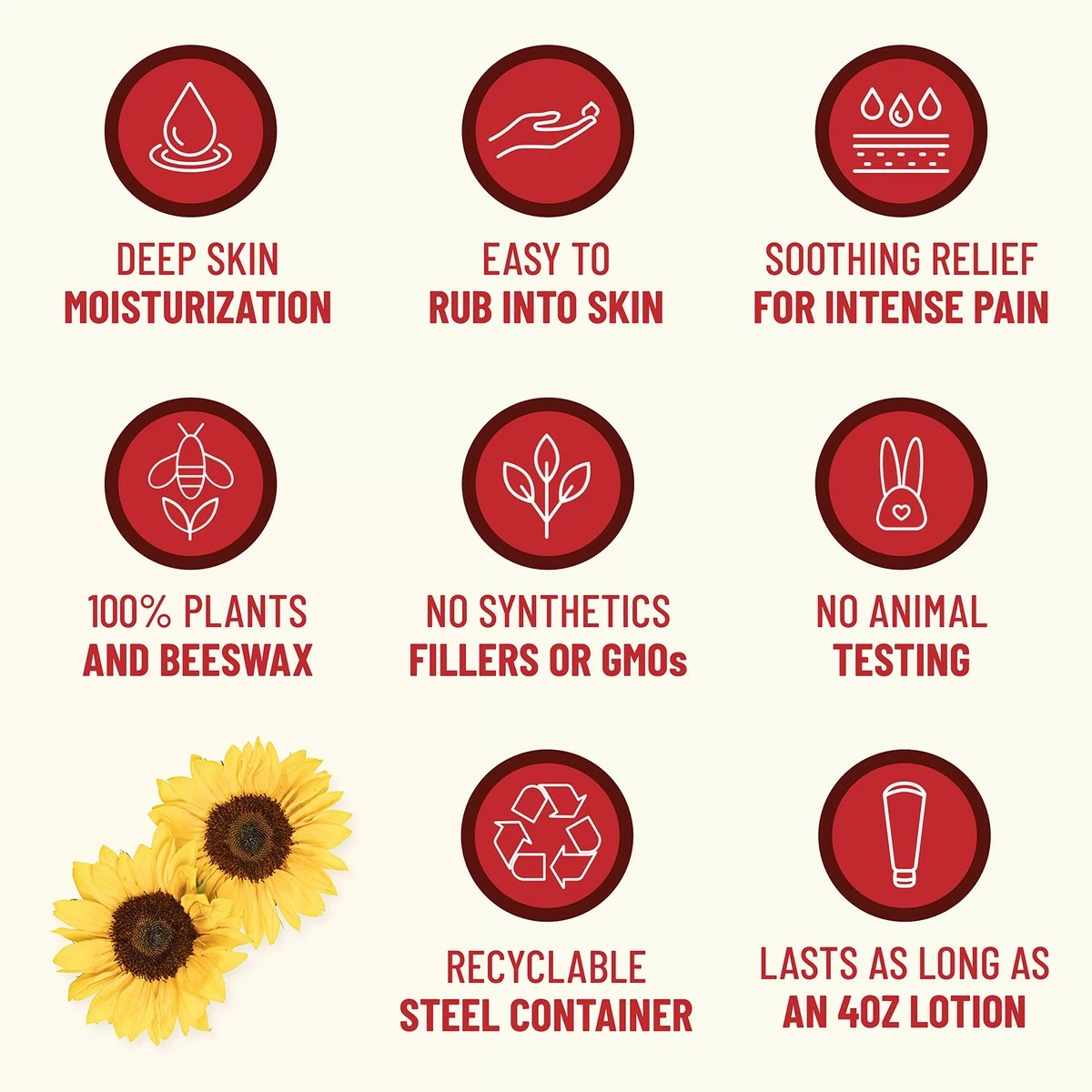- SUSTAINABLE – Packaged in a recyclable steel can, the product contains only plants + beeswax and is safe for the body, adults and children, animals, waterways, soil, and earth. Cruelty Free: our products are never tested on animals and never use any ingredients that have been tested on animals.