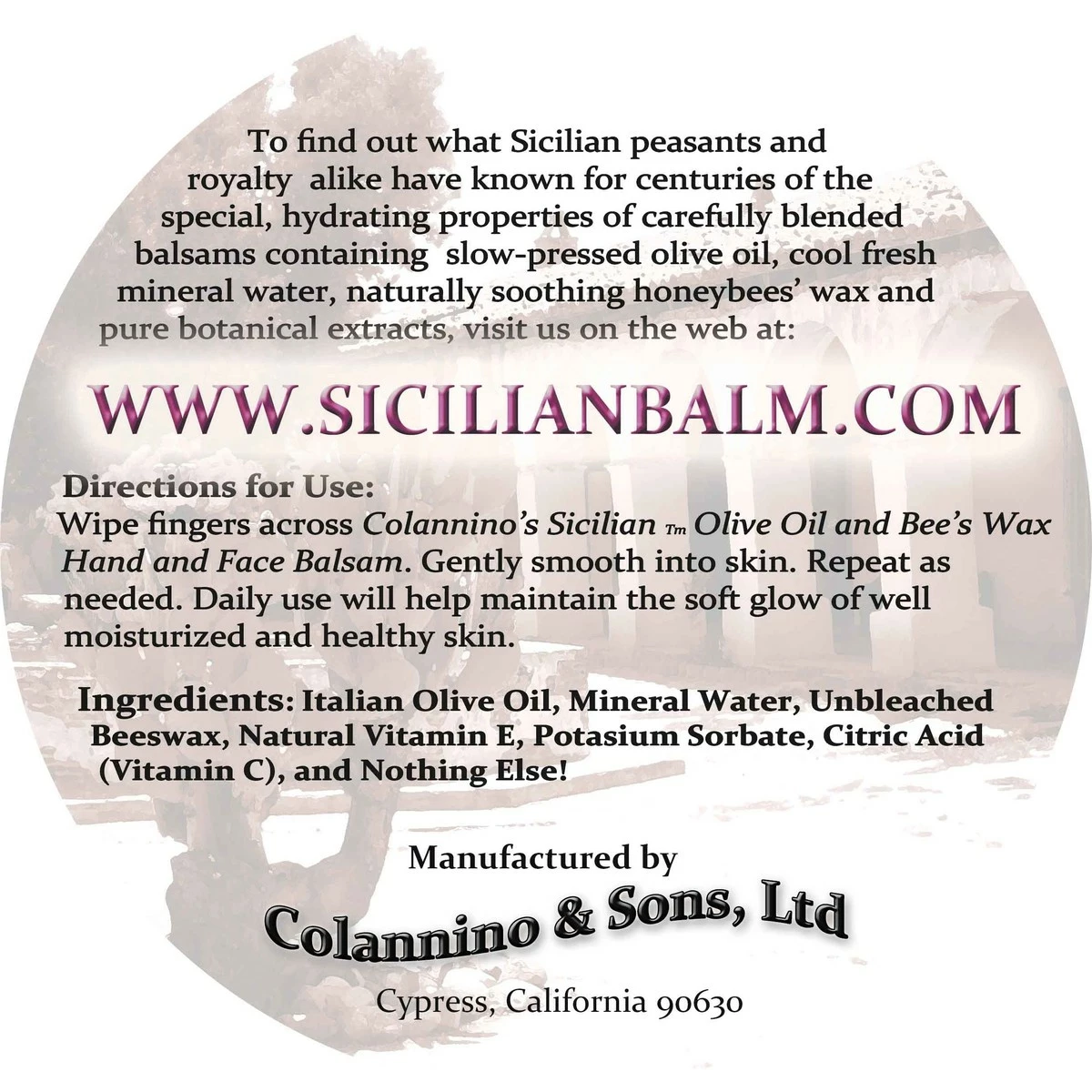 For centuries, Sicilian peasants and royalty alike have known of the special hydrating properties of carefully blended balsams containing slow-pressed Olive Oil, cool fresh Mineral Water, naturally soothing Honeybees Wax, pure Botanical Fragrance Oils and rare Flower-Petal Waxes. Colannino’s Sicilian(TM) Hand and Face Balsam(TM) brings you this ancient Sicilian treasure to help freshen and moisturize parched, overworked hands and windblown, sun-baked skin. In addition, Colannino’s Sicilian(TM) Hand and Face Balsam(TM) is all natural, petroleum free, pH balanced and specially formulated for delicate facial skin. It is not now and never will be tested on animals. USES: An excellent facial moisturizer, hand protectant and cuticle cream. If you need to seal, hydrate and protect the skin on any part of your body, this is your product!