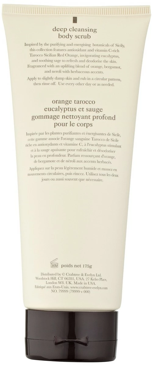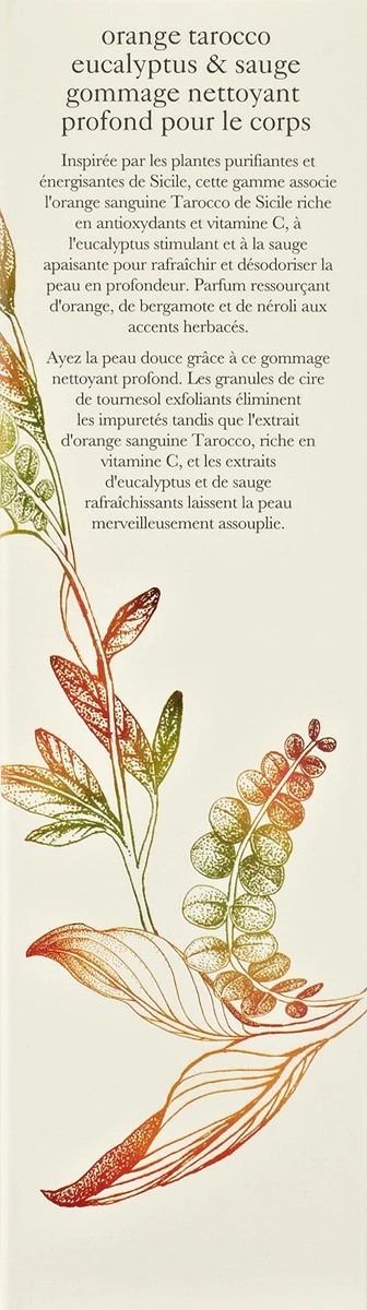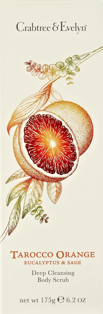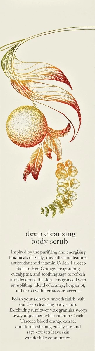 - Scrub up nicely with our sirocco orange, eucalyptus and sage body scrub. In addition to exfoliating sunflower wax beads that slough off dead cells, a conditioning blend of sirocco blood orange, petit grain, juniper berry and angelica extracts.