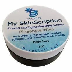 My Skinscription firming and tightening body cream. That deep rich color comes from the chicory root extract. Chicory root has skin firming peptides that strengthen skin’s structural fibris. It will boost the skins ability to produce collagen which means more elasticity, less lines and fewer wrinkles. Marine collagen helps to provide the formation of healthy, strong skin. Paullina seed extract comes from the Guarana seed . It has the capacity to reshape, tighten and smooth the skin. It helps reduce the “orange peel” look and stimulate circulation. This firming treatment is rich and buttery and also contains Jamaican black castor oil, coconut oil, hyaluronic acid and more ingredients that are necessary for skin firming and tightening. The scent is Pineapple Whip and it smells divine.