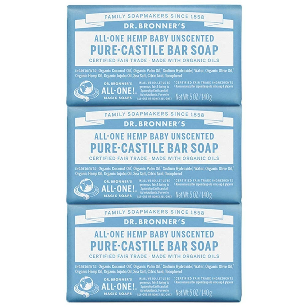 With no added fragrance and double the olive oil, our Baby Unscented Pure- Castile Bar Soap is good for sensitive skin and babies too (though not tear- free!). Dr. Bronner’s Bar Soap is made with certified fair trade ingredients and organic hemp oil for a soft, smooth lather that won’t dry your skin. 100% biodegradable in a 100% post-consumer recycled wrapper. Dr. Bronner’s Pure- Castile Bar Soaps are vegan, gentle, and versatile. Perfect for washing your face, body, and hair! With no synthetic preservatives, detergents, or foaming agents, they are even gentle enough for sensitive skin. They will leave your skin feeling soft, smooth, hydrated, and moisturized. Our Pure-Castile soaps are never tested on animals and completely cruelty-free.