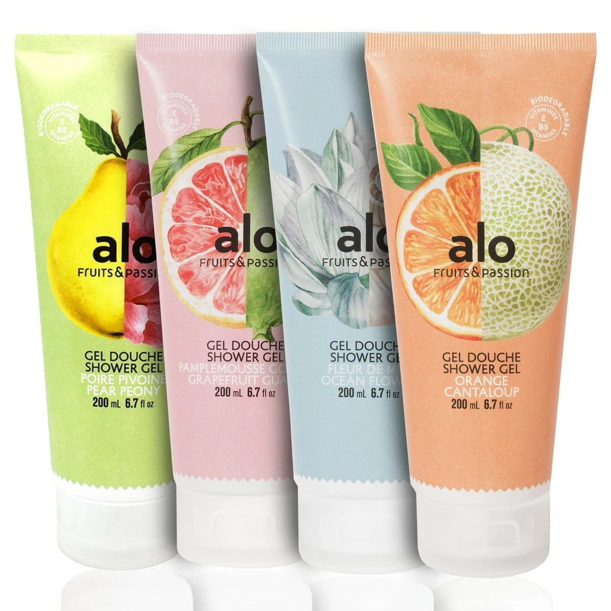 ALO! There are many ways to say Hello but ALO is the greeting from the beautiful Caribbean for a warm welcome to the scent of exotic fruits and flora, which captures the vibe of tropical islands. ALO is the new bodycare line from Fruits & Passion that embodies the passion and the sunshine of the Caribbean fruits. The revitalizing essence of the tropical fruit share its spirit and vitality. ALO carries from soaps to body wash with a wide variety of enticing fragrances to meet all your senses. Revitalizes and lifts your spirit from the everyday stress and fatigue with ALO line. **GRAPEFRUIT GUAVA** : The sparkling nergy of grapefruit and the smooth sweetness of guava fill your day with elegance of this luminous fragrance. **SHOWER GEL** : Take care of yourself and the environment with our biodegradable shower gel. Its gentle cleansing formula is enriched with vitamins E and B5, known for their hydrating and antioxidant properties. Product made in Canada