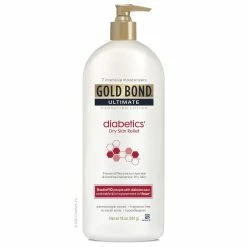 Gold Bond Ultimate Diabetic lotion for dry skin relief, diabetic skin relief, reduces skin discomfort irritation and dryness. Diabetes can affect the skin by drying it out and by making it harder for the body to heal itself. Fortunately, most skin conditions can be prevented or treated with moisturizing formulas that are designed for the skin care needs of people with diabetes. With a blend of moisturizers, vitamins and skin protectant, specially selected for diabetic skin care needs, diabetic skin relief from Gold Bond Ultimate is proven safe and effective at replenishing vital moisture and soothing problem skin. Dermatologist tested among people with diabetes, this formula is fragrance free and hypoallergenic, so they are appropriate for daily use. The body lotion is a medium weight lotion for the daily relief and Prevention of dry, depleted skin.