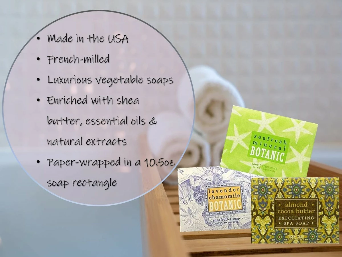 French-milled, luxurious vegetable soaps enriched with shea butter, essential oils & natural extracts in captivating botanical scents.