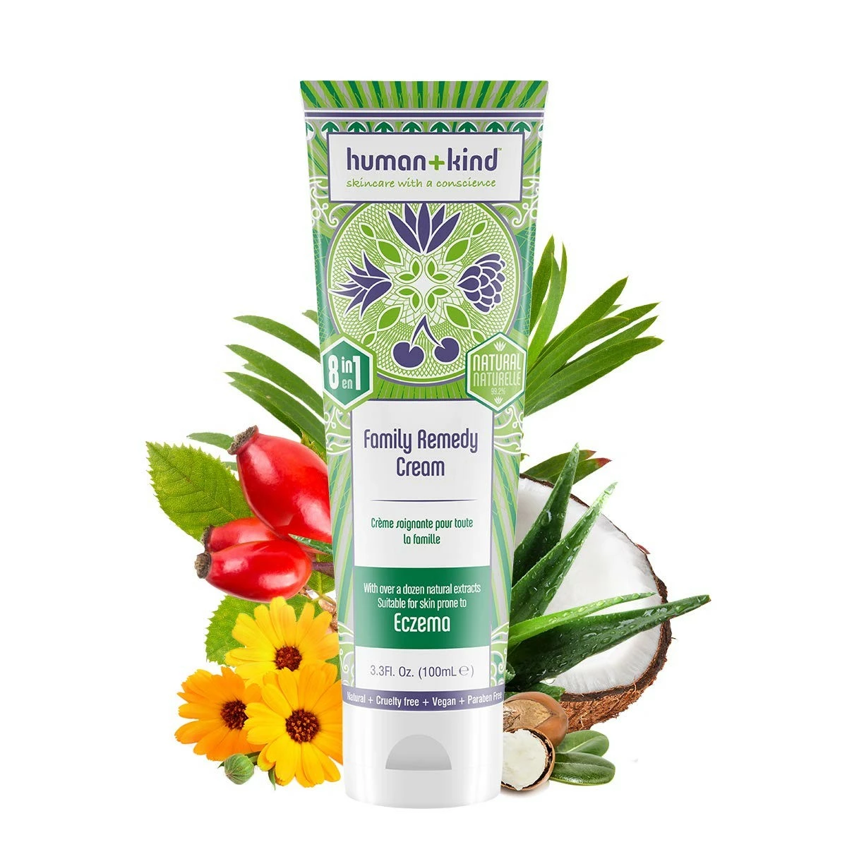 Human+Kind’s Family Remedy Cream is an 8-in-1 formulation that solves problems for the whole family. It is kind to skin and helps soothe and reduce the appearance of eczema, psoriasis and acne. It works wonders on dry and sensitive skin, itching, razor burn, athlete’s foot, insect bites and stings, brittle nails, and sunburn. Apply to the affected area 2-3 times daily until the condition improves. For use on any discomfort, including dry, itchy skin. Dermatologist-tested. Suitable for eczema-prone skin.