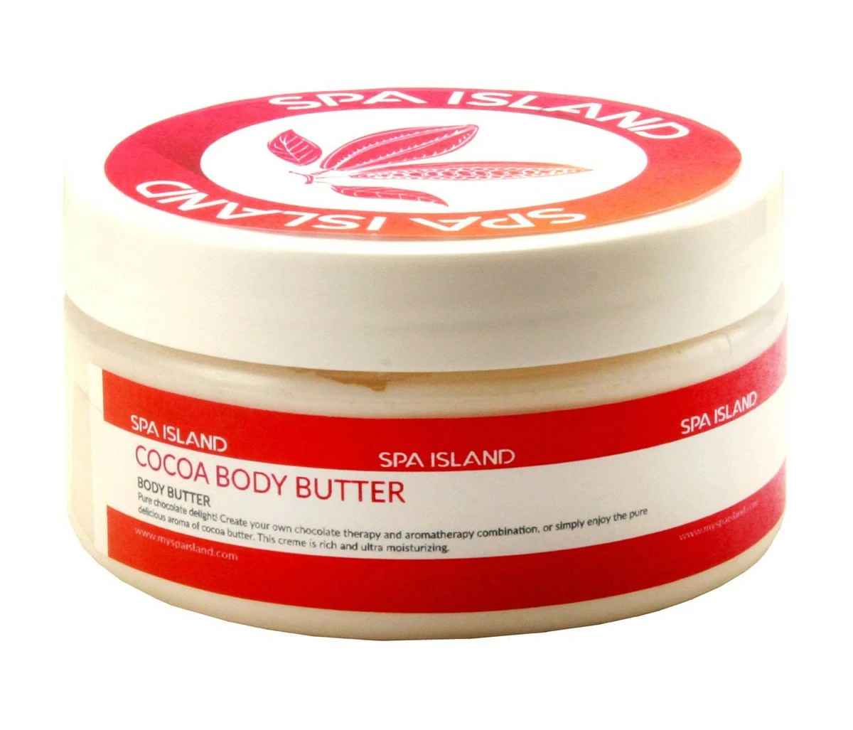Spa Island body butter cream is made of 80 percent organic ingredients. Body butter cream leaves your skin feeling silky smooth, moisturized and healthy. Body butter is cocoa scented. Ten ounce container. Ingredients include: Natural cocoa coconut oi