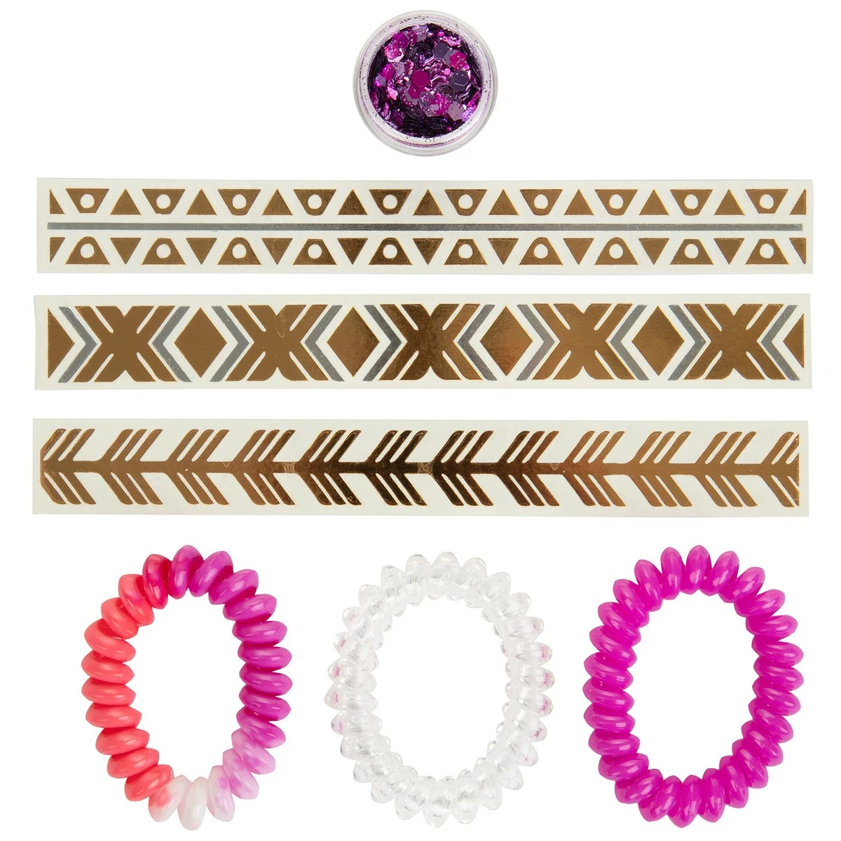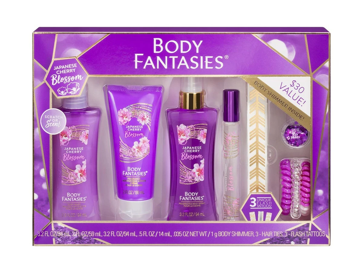 - 3.2 oz Body Spray, 3.2 oz Body Wash, 2 oz Lotion, .5 oz Eau De Toilette Spray, .035 oz Body Shimmer, 3 Hair Ties, and 3 Flash Tatoos