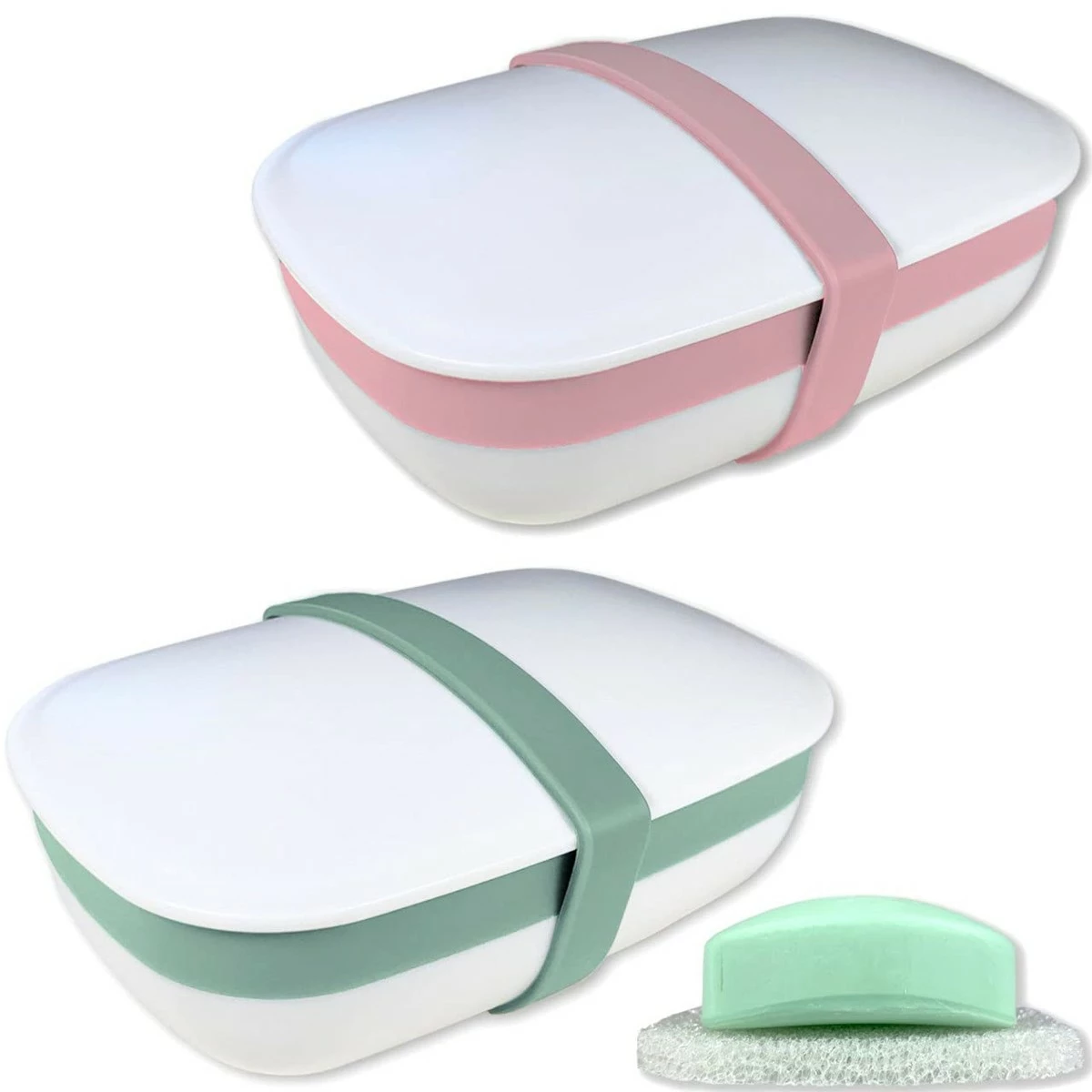 Kiasona 2Pack Travel Soap Holders, Soap Bar Box Dish Container Case, with Sponge Saver& Band, for Gym, Travel (Pink & Green)
