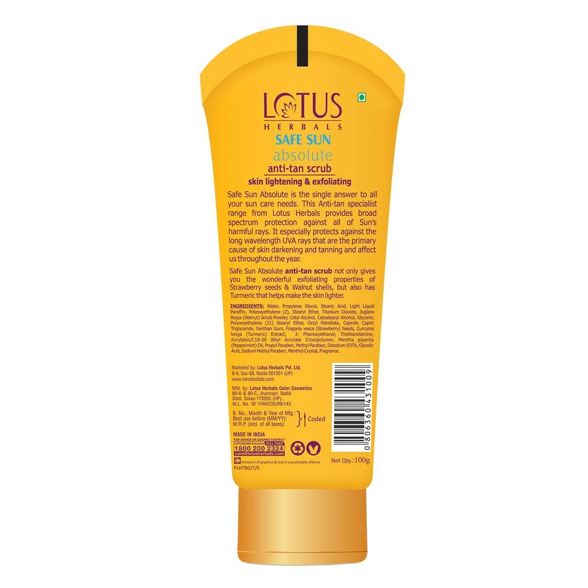 Lotus Herbals Safe Sun Absolute Anti-Tan Scrub is formulated using natural ingredients like turmeric, walnut and strawberry seeds and is designed to gently exfoliate your skin off dead cells and tan to reveal brighter, fresher, younger skin. This anti-tan scrub lightens your skin tone and reduces the appearance of blemishes and brown spots making you glow with flawless looking skin with every wash!