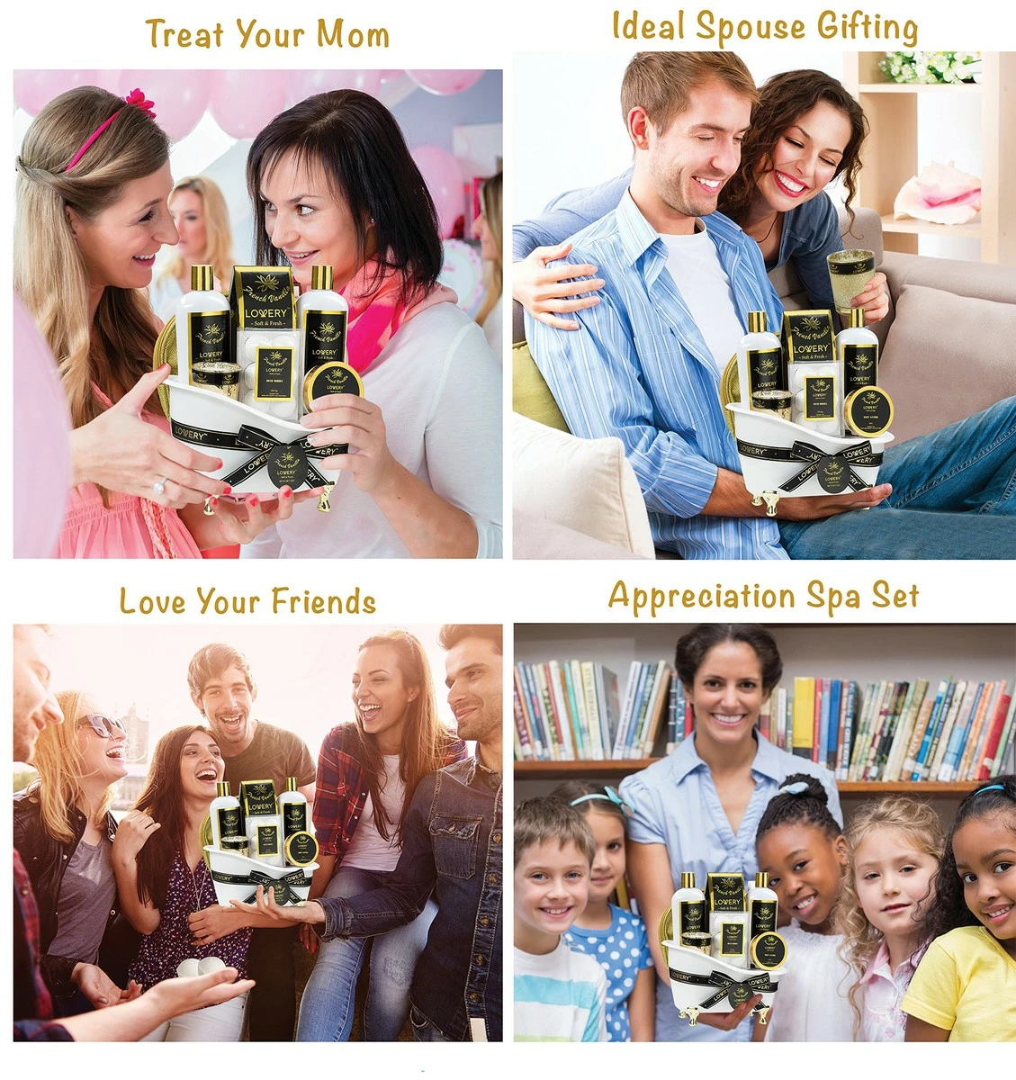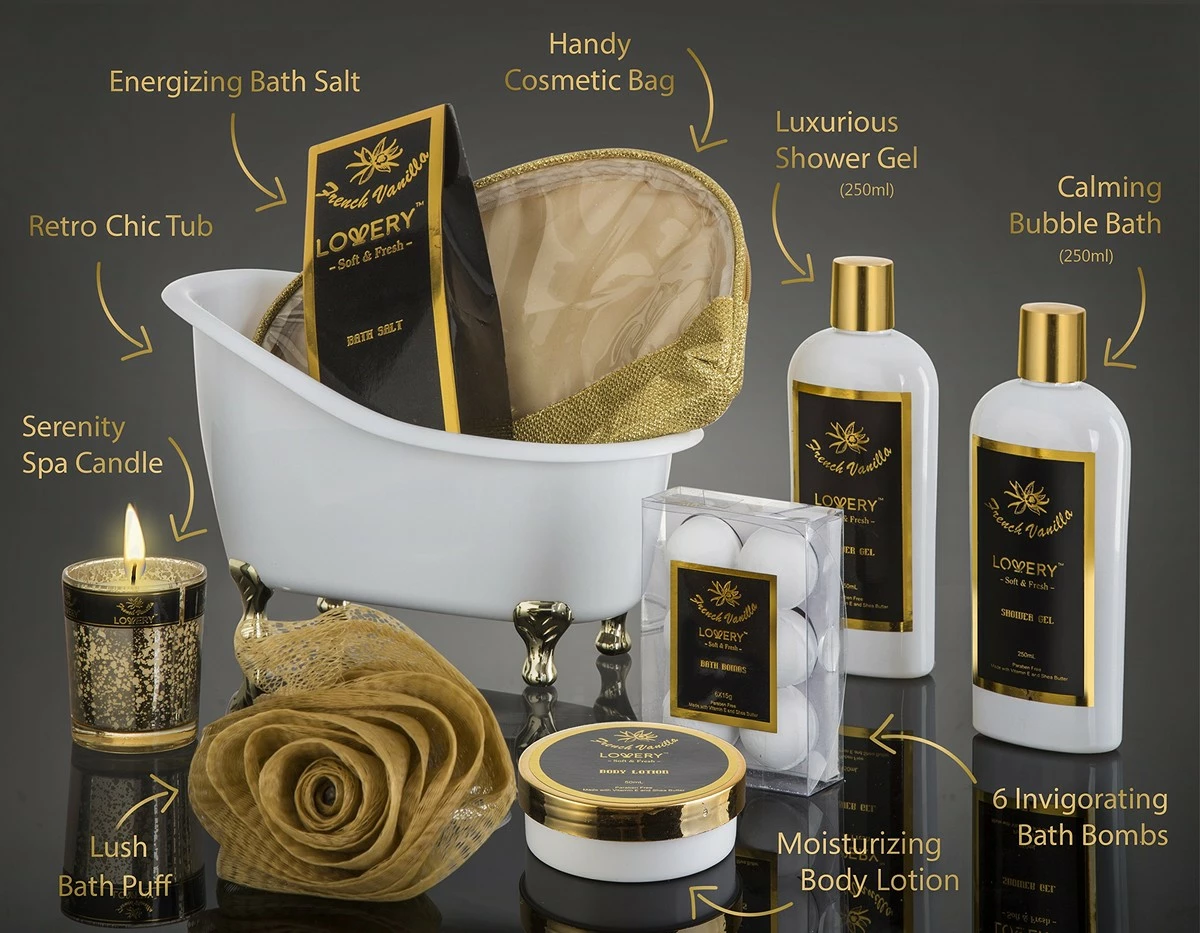 * French Vanila is an incredible elegant scent with soft, sheer floral &vanilla notes * Full 14 piece set contains an assortment of lush bath accessories * Beautifully wrapped & packaged for the ultimate presentation with a ribbon & tag * Blank lined gift note attached to write a heartfelt message * Formulated with Shea Butter & Vit E to moisturize & protect * Purely sourced ingredients, clearly displayed on packaging * Lovery’s items are Paraben-Free & Never Tested On Animals * 100% Satisfaction Guarantee – love it or your money back!