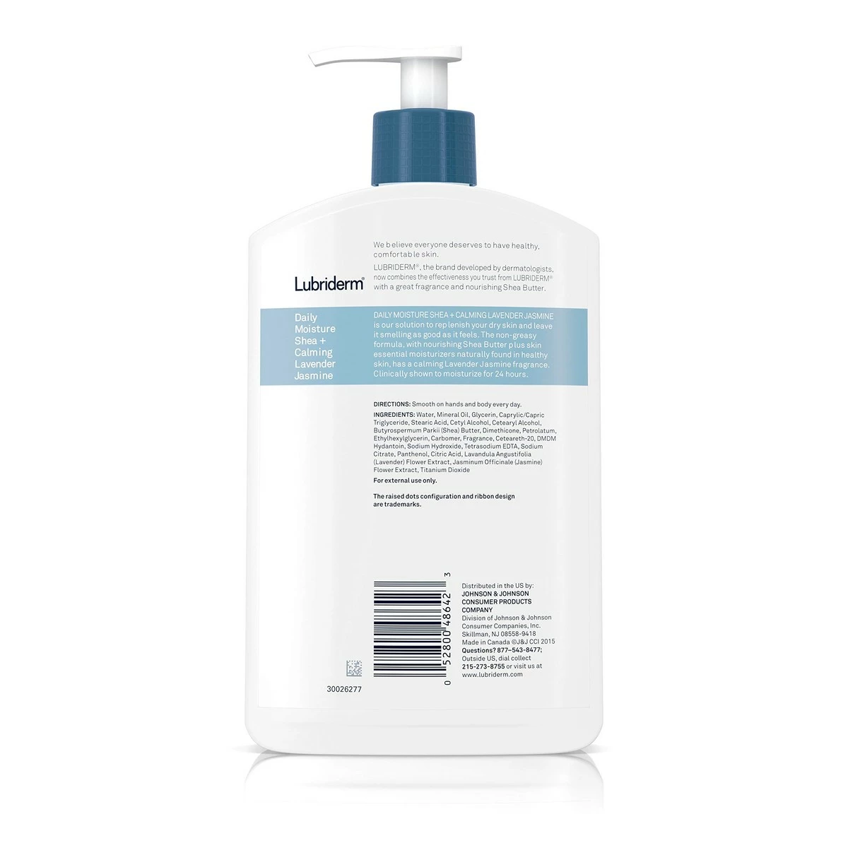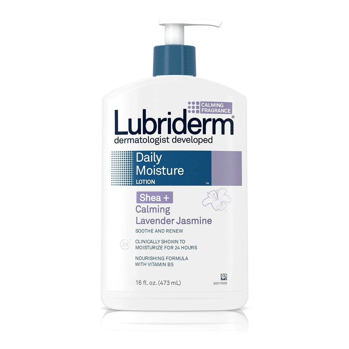 Nourish dry skin and leave it smelling as good as it feels with Lubriderm Daily Moisture Body Lotion with Nourishing Shea Butter + Calming Lavender Jasmine. This non-greasy daily lotion has been clinically shown to moisturize skin for 24 hours. It contains Vitamin B5 and shea butter to replenish dry skin, leaving it feeling soft and healthy-looking. The lotion absorbs quickly and has a calming lavender and jasmine fragrance.