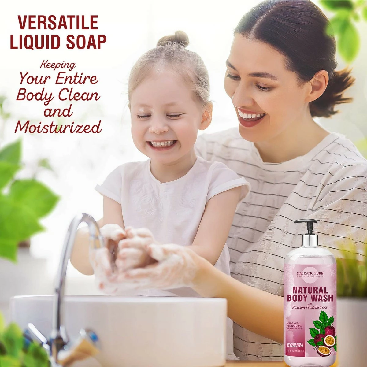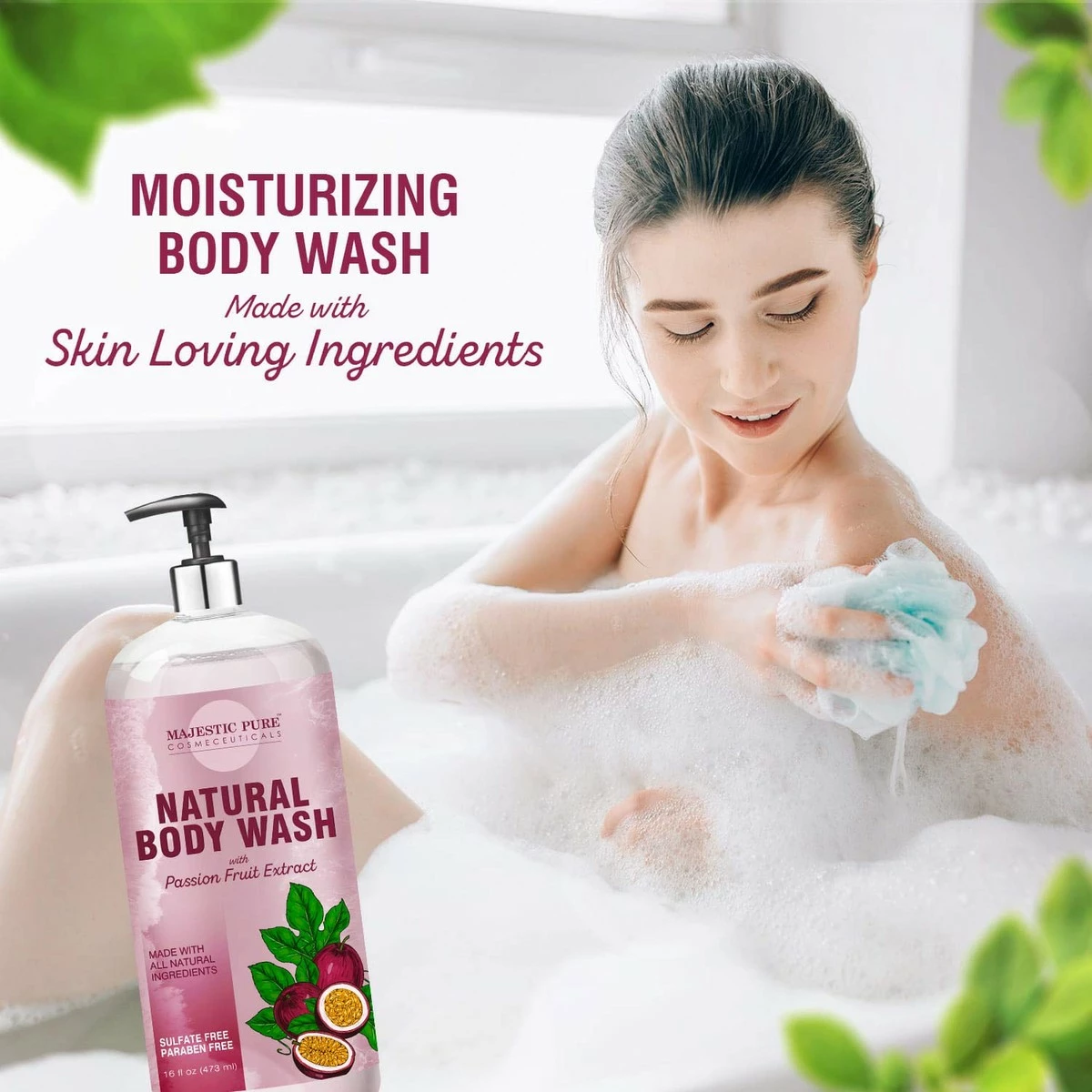 Majestic Pure Natural Body Wash with Passion Fruit Extract is carefully crafted with skin nourishing ingredients such as Coconut Oil, Olive Oil, Jojoba Oil and Shea Butter Oil to clean and hydrate skin for clear, supple, and youthful look. This wonderful wash is suitable for all skin types; for dry, normal, and oily skin, for men and women. **Click the button at the top of this page to buy with confidence.**