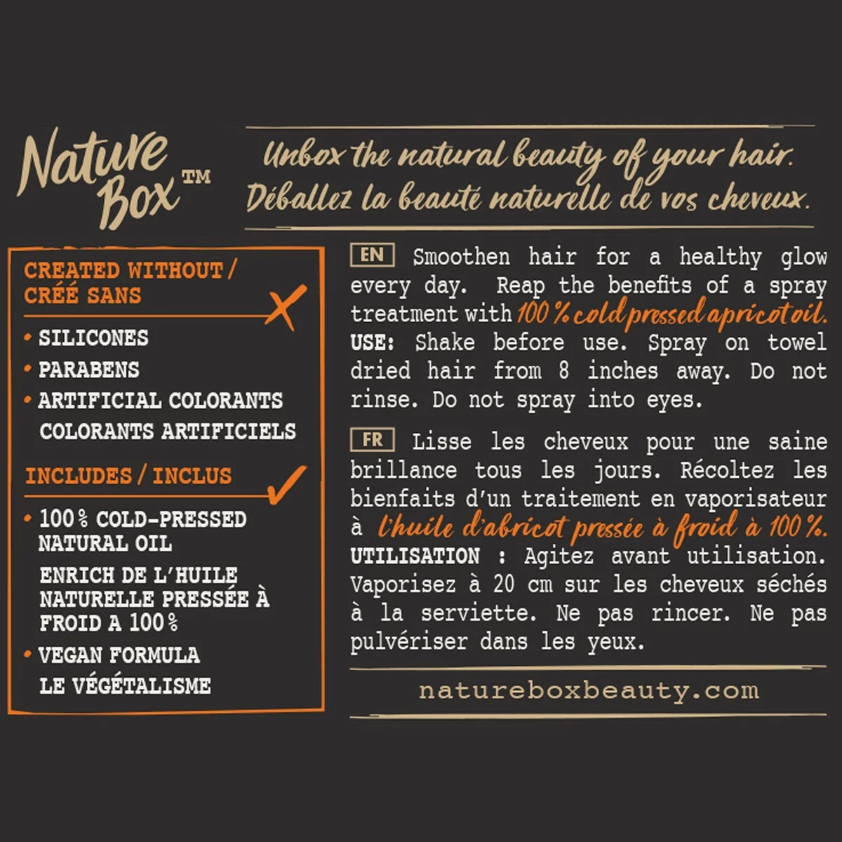 Smoothen hair for a healthy glow every day. Reap the benefits of New Nature Box Apricot Oil Shine Spray, which contains 100% cold-pressed, natural Apricot oil, and the antioxidant Vitamin E. This unique shine spray is formulated without silicones, parabens and artificial colorants. For best results to provide instant hair softness and shine, use in combination with New Nature Box Apricot Oil Shampoo and New Nature Box Apricot Oil Conditioner.