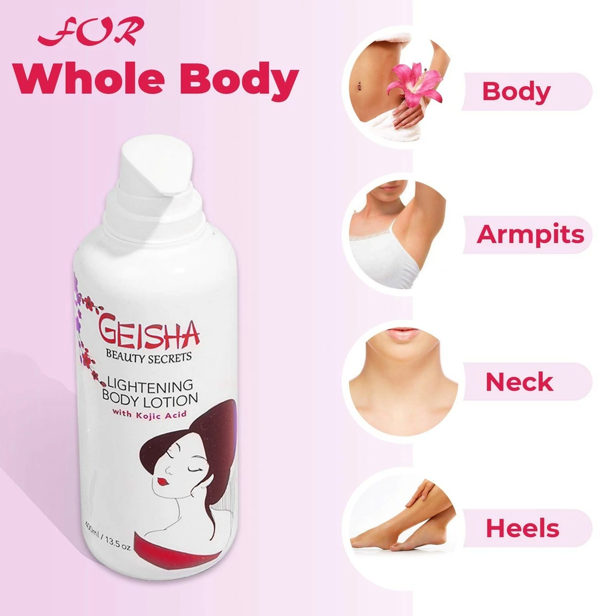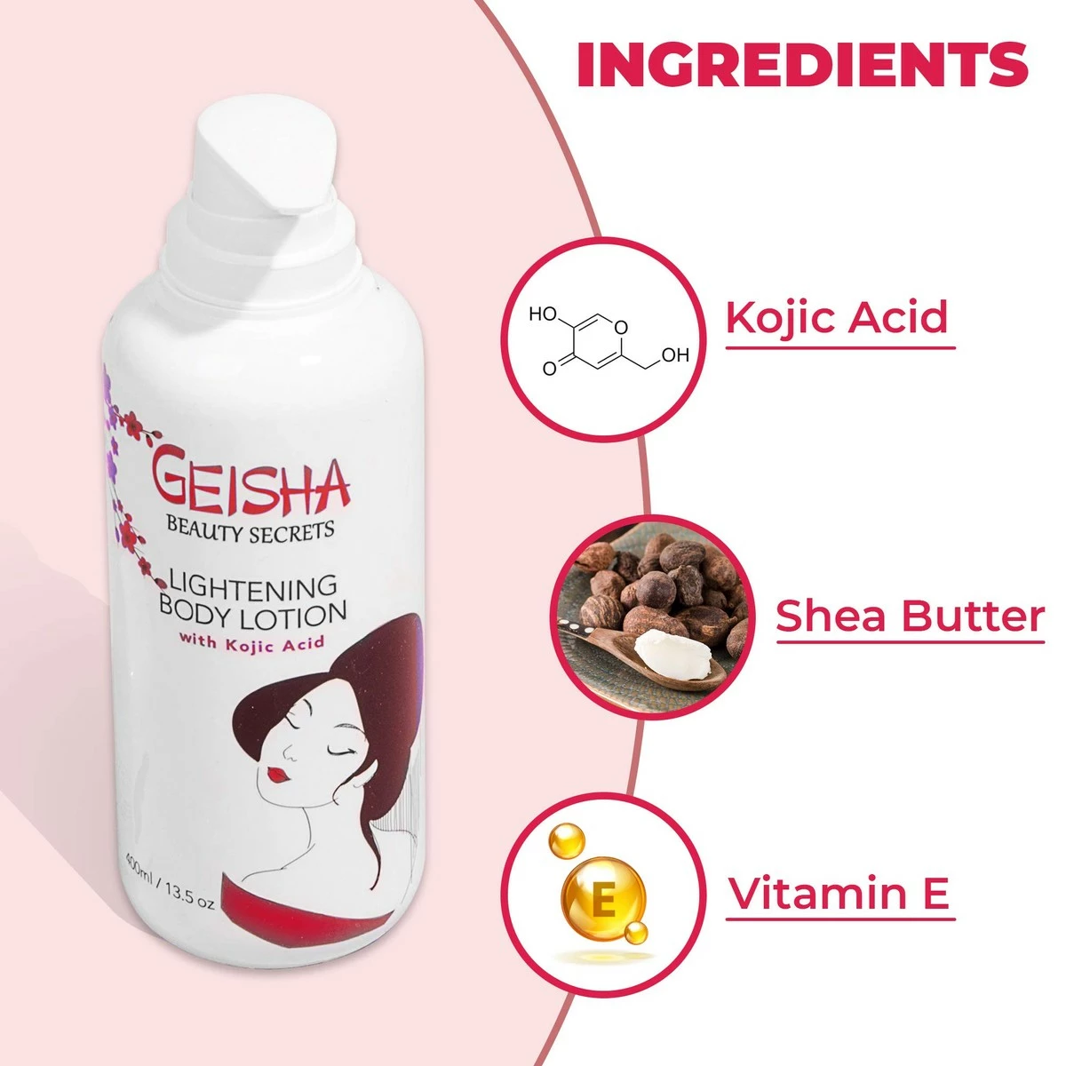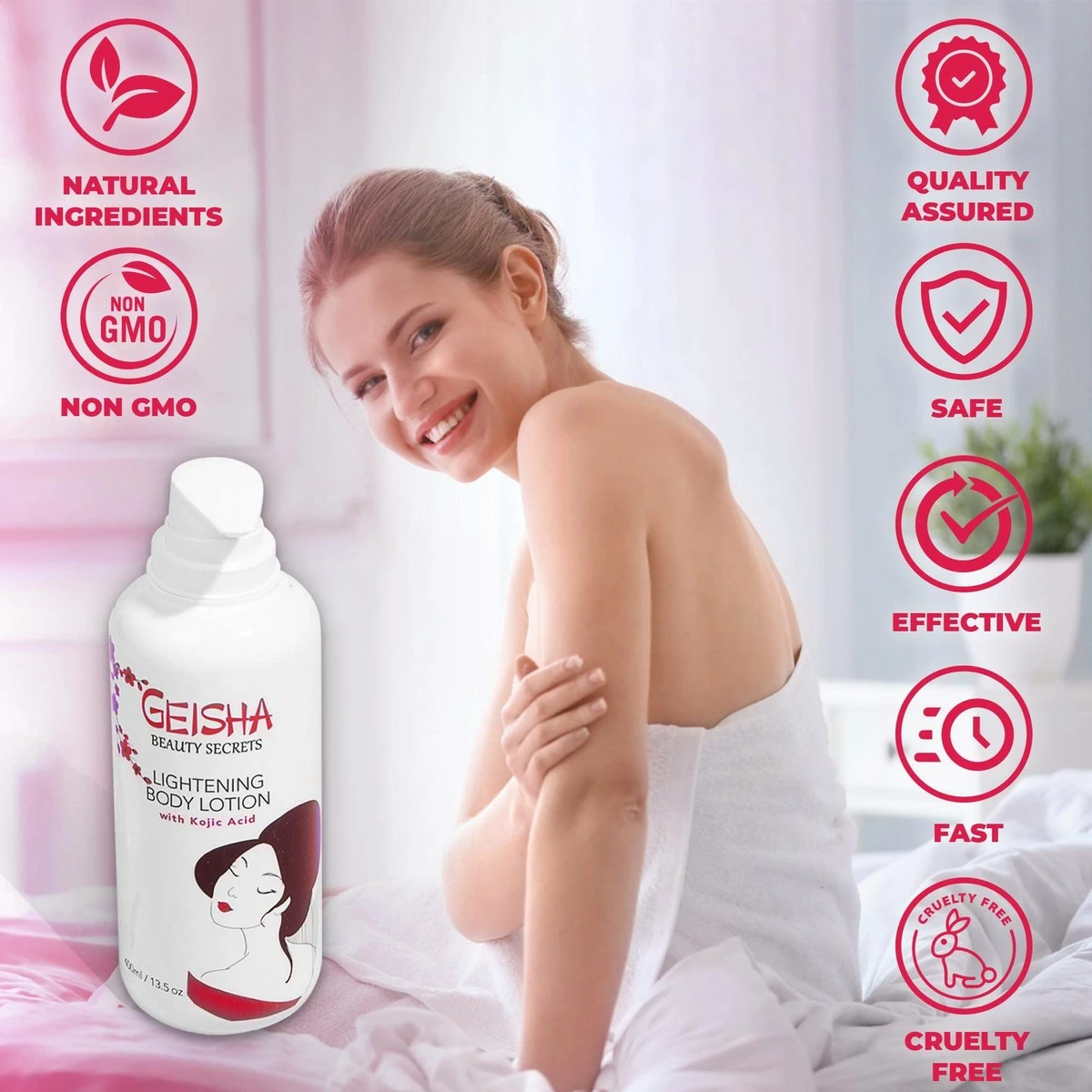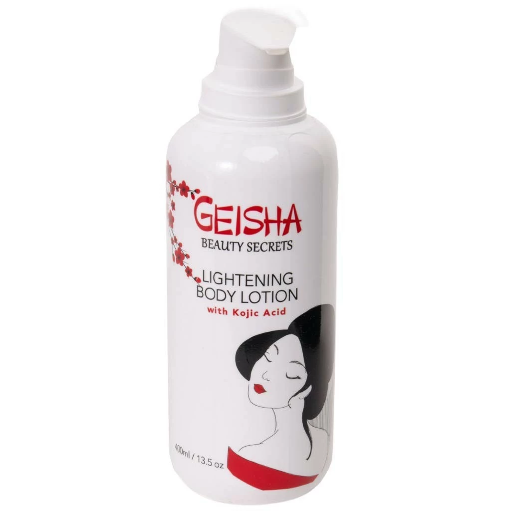- GEISHA BEAUTY SECRETS FORMULA: Lightening Body Lotion has the power to give you an even complexion that is free of scars, blemishes, red and dark spots, and other skin imperfections. This skin lightening body lotion will give you the skin of your dreams! Try it out and see for yourself!