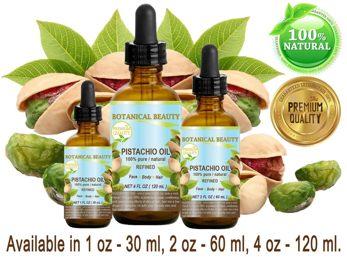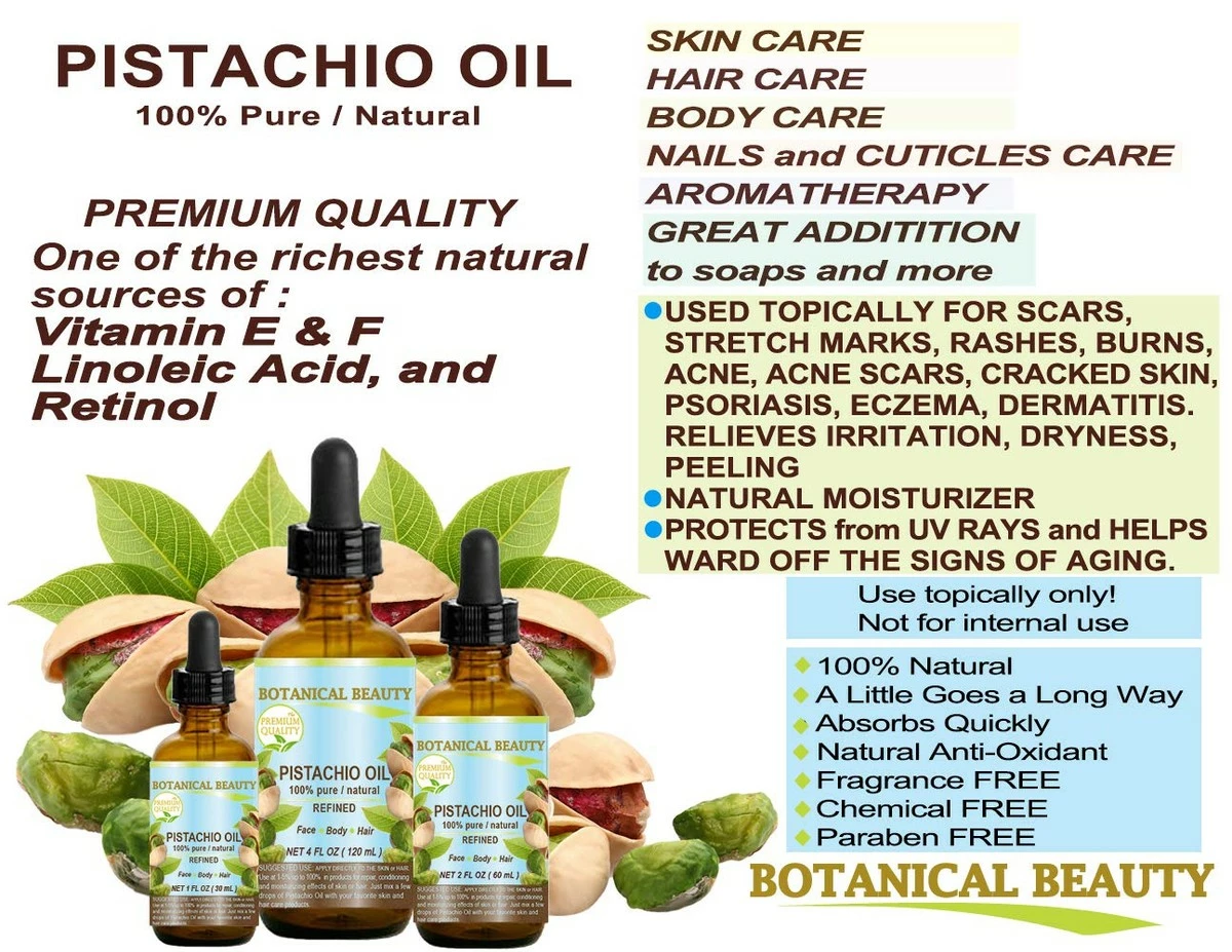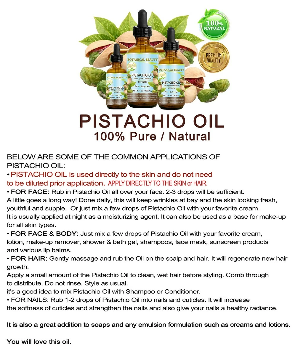 Botanical Beauty PISTACHIO OIL has restorative & antioxidant properties deeply hydrates the skin, help to heal damaged skin and makes it look younger and suppler. PISTACHIO OIL is a GENIUS Oil for Skin & Hair. A Little Goes a Long Way, Absorbs Quickly, Not Greasy, Chemical Free, Not tested on Animals, Does not contain any preservatives.