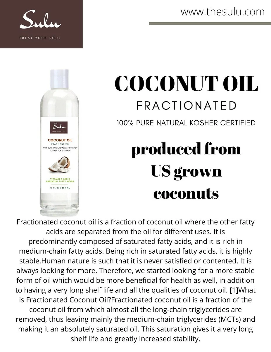 Fractionated coconut oil is a fraction of coconut oil where the other fatty acids are separated from the oil for different uses. It is predominantly composed of saturated fatty acids, and it is rich in medium-chain fatty acids. Being rich in saturated fatty acids, it is highly stable. Human nature is such that it is never satisfied or contented. It is always looking for more. Therefore, we started looking for a more stable form of oil which would be more beneficial for health as well, in addition to having a very long shelf life and all the qualities of coconut oil. [1] What is Fractionated Coconut Oil? Fractionated coconut oil is a fraction of the coconut oil from which almost all the long-chain triglycerides are removed, thus leaving mainly the medium-chain triglycerides (MCTs) and making it an absolutely saturated oil. This saturation gives it a very long shelf life and greatly increased stability. This coconut oil contains 50% lauric acid. Fractionated coconut oil is closest substance to human sub-cutaneous fat and more compatible with skin than vegetable oils. She states that it has a virtually unlimited shelf life, since it can not turn rancid, and that it can not clog pores, making it an ideal carrier for oily or troubled skin. Fractionated Coconut oil is our diluent of choice. Its light texture and total lack of aroma make it perfect for diluting the most fragile absolutes and essences. Its extraordinarily long shelf life means you never have to worry about a rancid fixed oil spoiling your precious aromatics.
