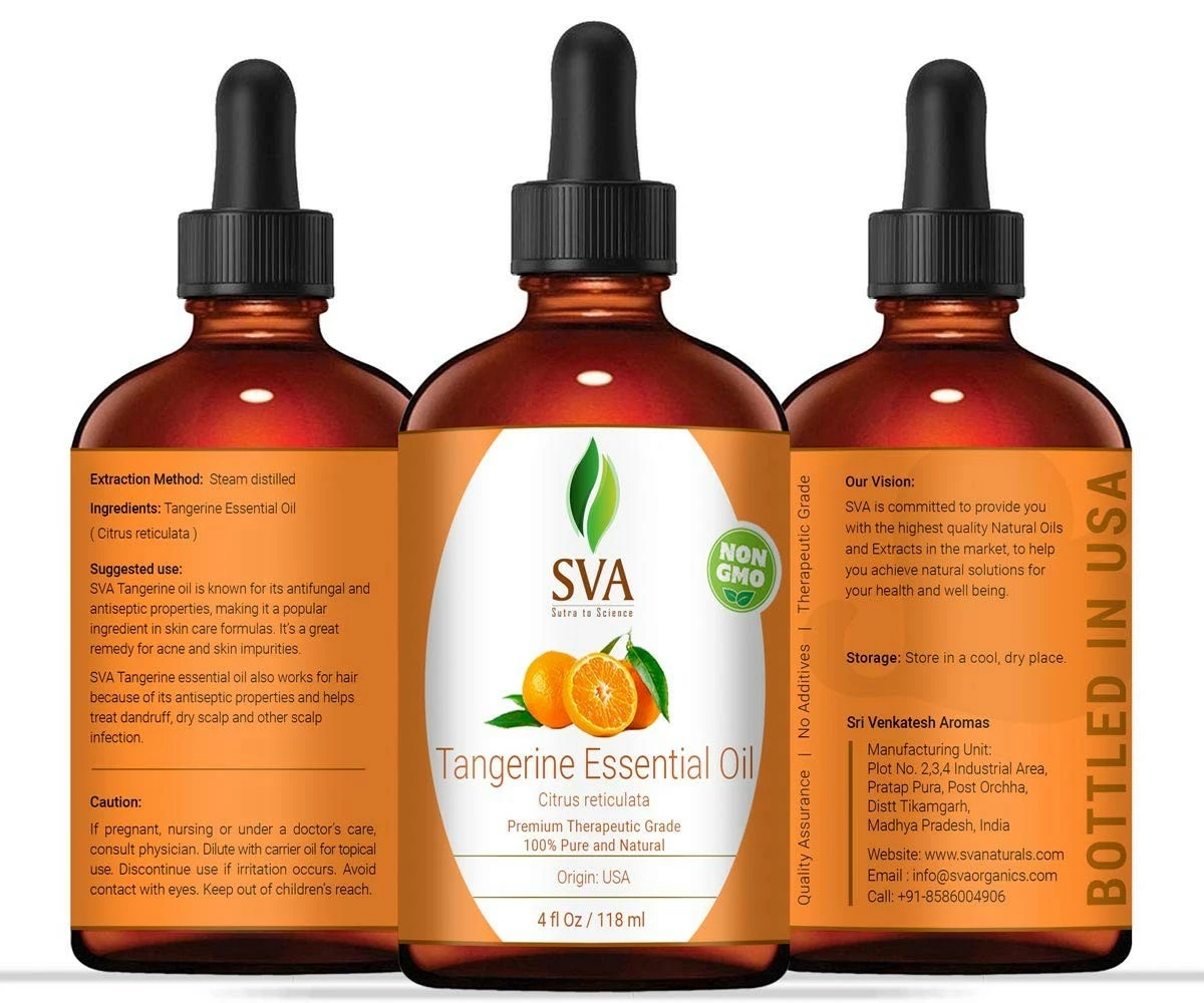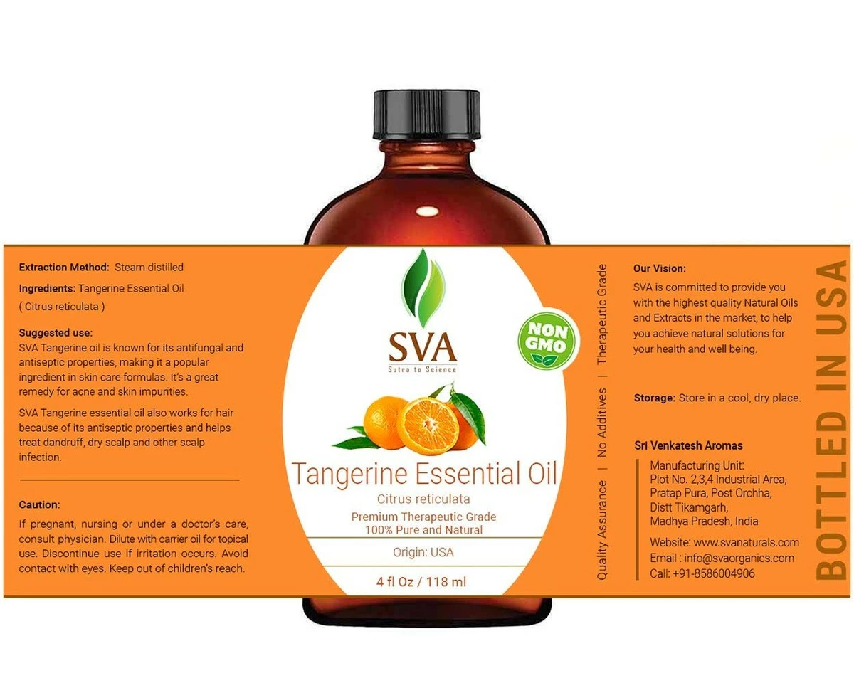 - PREMIUM THERAPEUTIC GRADE TANGERINE OIL: – SVA ORGANICS TANGERINE Oil is obtained by from Citrus Reticulata fruit peel. It is 100% Pure & Natural, Authentic essential oil. Our TANGERINE Oil is bottled in USA and is not tested on Animals. We care for you!
