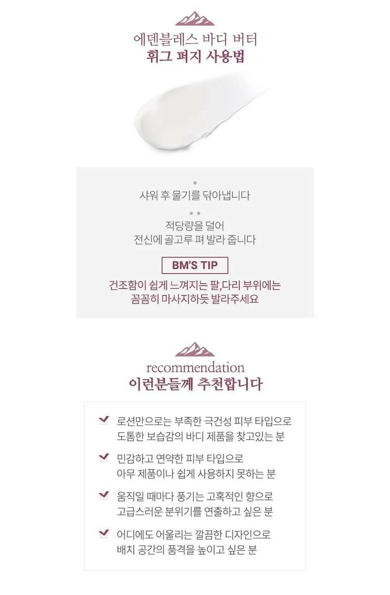 **How to Use :** After taking a shower, remove the water and apply an appropriate amount. Please apply moisturizing cream to dry areas. -MADE IN KOREA