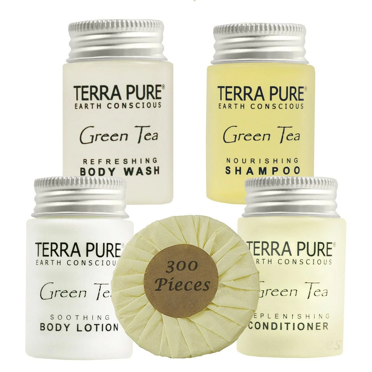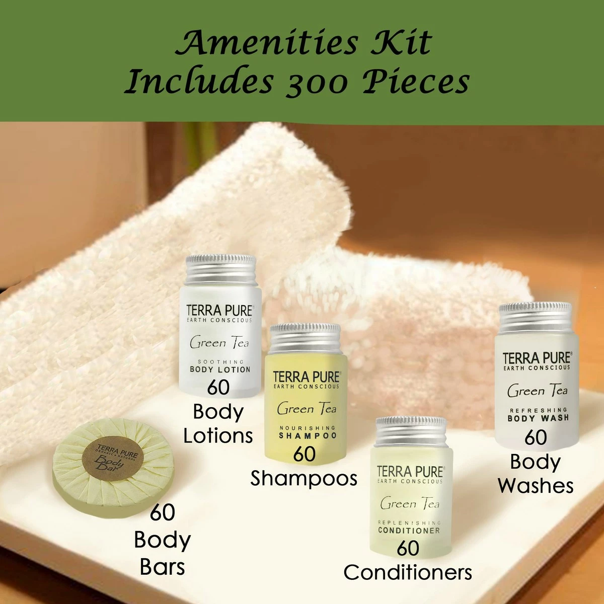 - IN THE BOX: This 300 piece mini toiletries set has everything you need to keep your guests comfortable. Your hotel kit includes 60 of each: Shampoo, Conditioner, Lotion, Body Wash & Soap Bar. Naturally scented with green tea for an invigorating and refreshing scent!