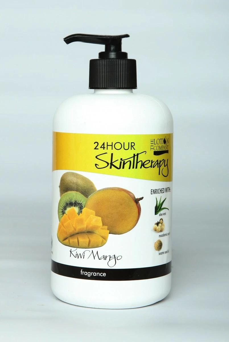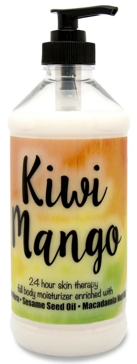 The Lotion Company’s 24-Hour Skin Therapy is a remarkable blend of ingredients selected to contribute to both health and beauty. These products are carefully handcrafted in modest-sized kettles, not mass-produced in giant vats. The resulting blend is uncommonly easy to apply and absorbs quickly, leaving your skin soft and silky all day. Enriched with aloe vera, macadamia nut oil and sesame seed oil, 24-Hour Skin Therapy offers immediate relief for dry, itchy, scaly skin anywhere on your body. Essential vitamins and minerals help calm, nourish, and rehydrate your skin. Glycerin provides additional moisturizing without the greasy residue that petrolatum-based lotions leave behind. Very popular in the healthcare community, 24-Hour Skin Therapy is gentle enough for sensitive skin and doesn’t irritate cracked, chapped skin. The Kiwi Mango’s fragrance is a mixture of exotic mango and kiwi exuding a tropical scent that will take you to a relaxing, secluded tropical island. There are twelve light, pleasant scents to choose from: Baby Powder, Citrus Tea, Dahlia Blossom, Fresh Breeze, Free & Clear (fragrance free), Kiwi Mango, Spring Cherry, Brown Sugar, Vanilla Bean, Vanilla Bean with Bronzer, Sweet Pea, and Lavender Field. Nothing is smoother. Nothing is finer. Your skin will tell the difference!