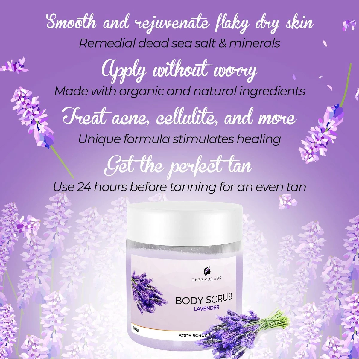 - MAKE YOUR SKIN AS SMOOTH AS YOU’VE ALWAYS WANTED – CRUELTY FREE: Thanks to the high quality dead sea salts and minerals in the scrub formula, Thermalabs Lavender scrub will moisturize and smooth your skin, making it wonderful to the touch, what’s more the scrub treatments are cruelty free, these products have not been tested on animals, meaning you can rejuvenate with a clear conscience