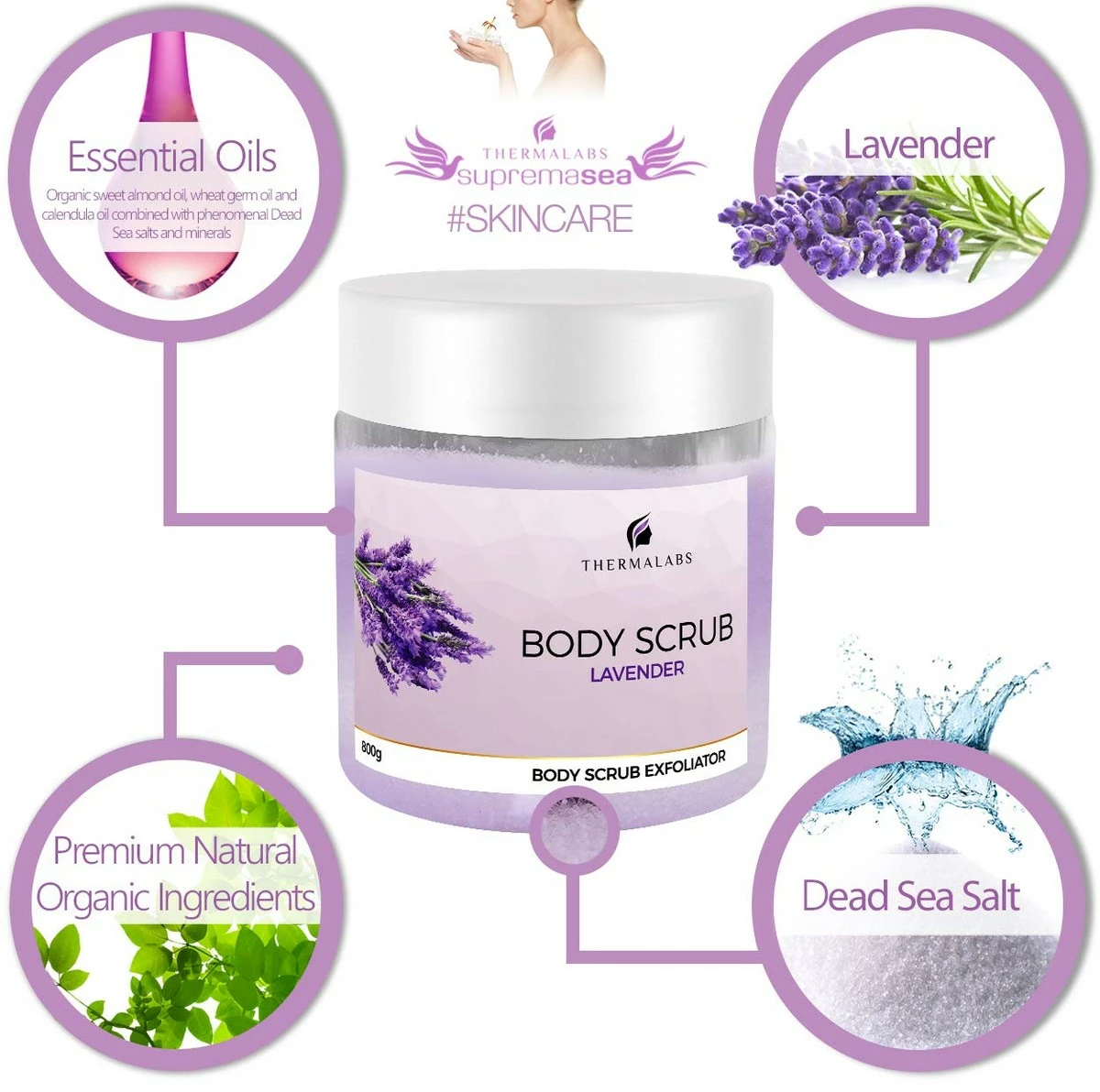 - MAKE CHAPPED, DRY SKIN A THING OF THE PAST! Your body will thank you, and your friends and family will swear you look younger after using Thermalabs lavender scrub exfoliator. Our exfoliator treats dry skin like magic thanks to its organic all natural essential oils, like sweet almond oil, wheat germ oil and calendula oil, combined with Dead Sea salts and minerals that provides gently, yet powerful exfoliation and restores moisture